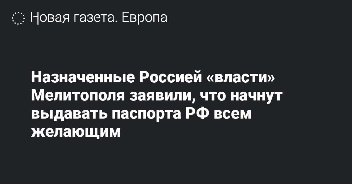 Назначенные Россией «власти» Мелитополя заявили, что в ближайшее время начнут выдавать российские паспорта всем желающим. Об этом сообщает РИА Новости.