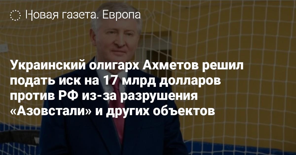 Украинский миллиардер Ринат Ахметов планирует подать иск на сумму не менее 17 млрд долларов к российским властям из-за разрушения завода «Азовсталь», ММК им. Ильича в Мариуполе, Авдеевского коксохима, Луганской ТЭС и десятков других объектов. Об этом он заявил в интервью изданию «НВ».
