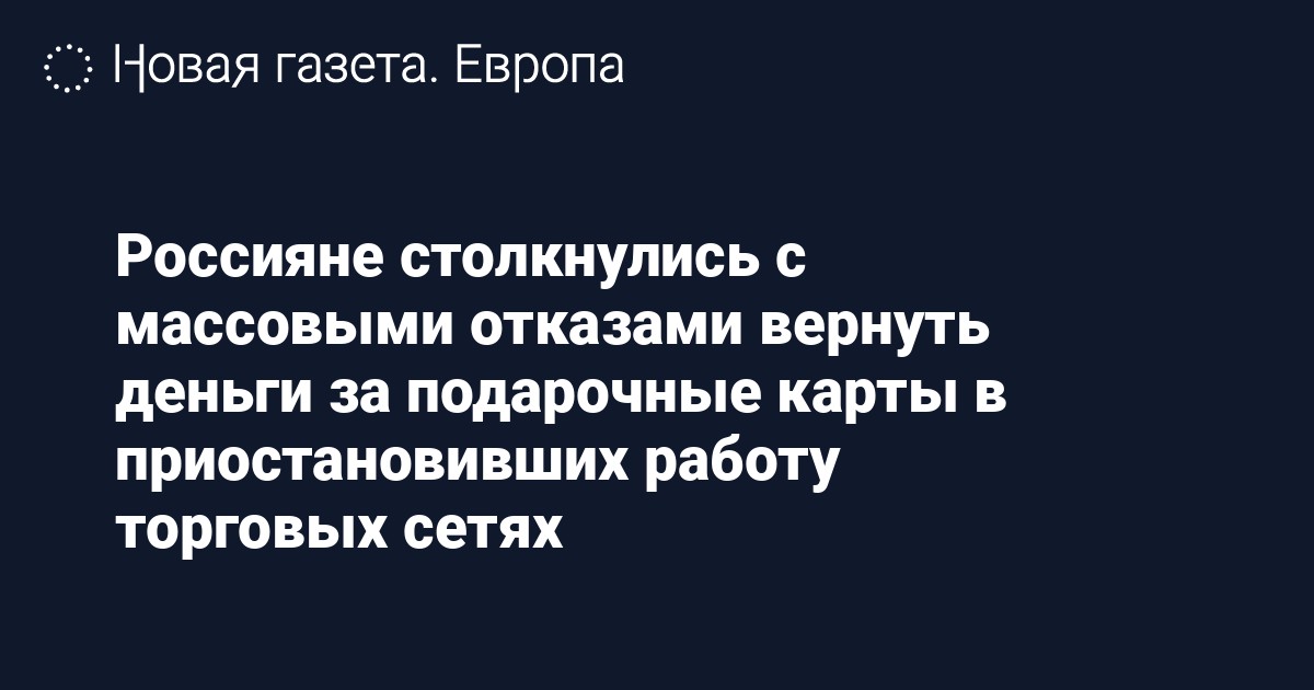 Российские потребители столкнулись с массовым отказом в возврате денег за подарочные карты и сертификаты в торговых сетях, приостановивших работу после вторжения России в Украине, сообщает «Коммерсант».