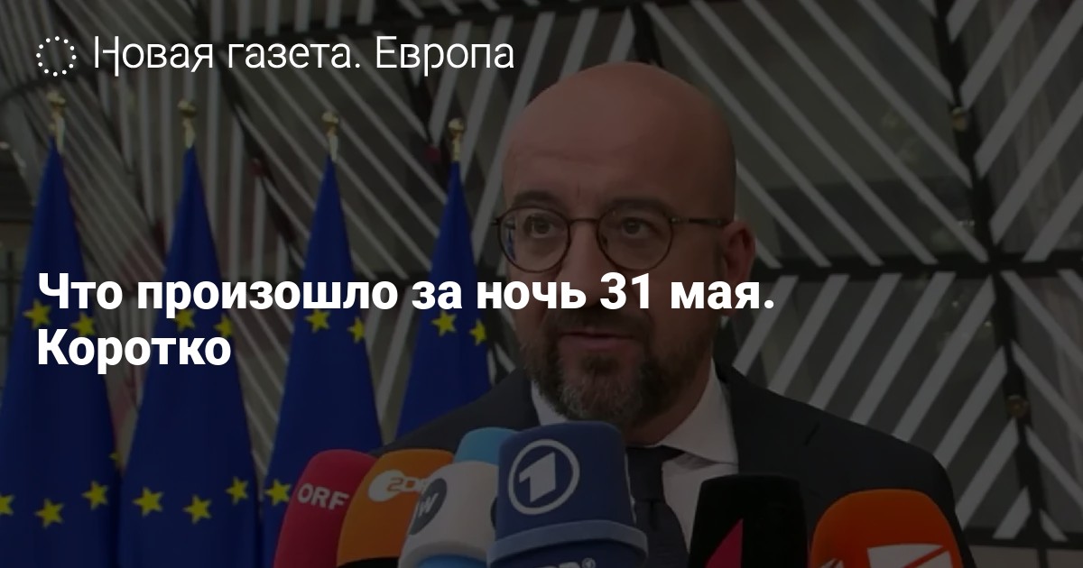 - Лидеры стран Евросоюза согласовали шестой пакет санкций против России, сообщил глава Европейского совета Шарль Мишель. Он включает в себя ограничение 2/3 импорта российской нефти, отключение «Сбербанка» от SWIFT, блокирование трансляции трех государственных вещателей России в ЕС, а также расширение списка подсанкционных лиц РФ, ответственных за военные преступления в Украине. Евросоюз также пообещал выделить Украине 9 млрд евро финансовой помощи. Благодаря новому пакету санкций, Евросоюз планирует до конца этого года отказаться от 90% нефтяного импорта из России, заявила глава Еврокомиссии Урсула фон дер Ляйен.