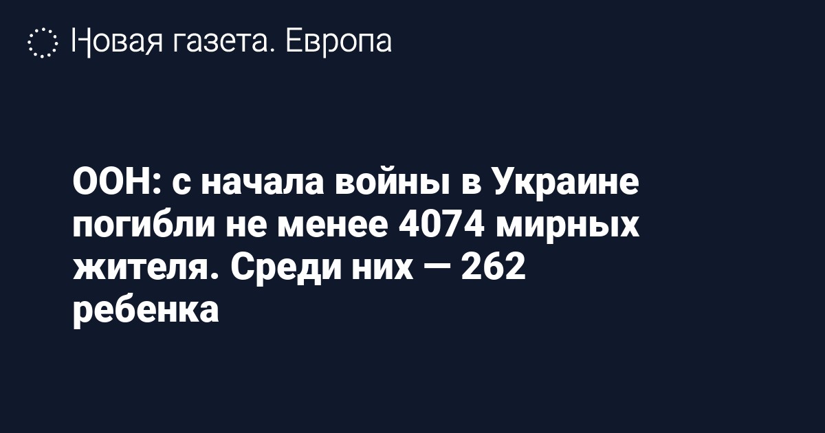 По меньшей мере 4074 мирных жителя погибли с начала российского вторжения в Украину. Еще 4826 человека получили ранения, сообщает Управление Верховного комиссара ООН по правам человека. По данным организации, среди погибших 262 ребенка.