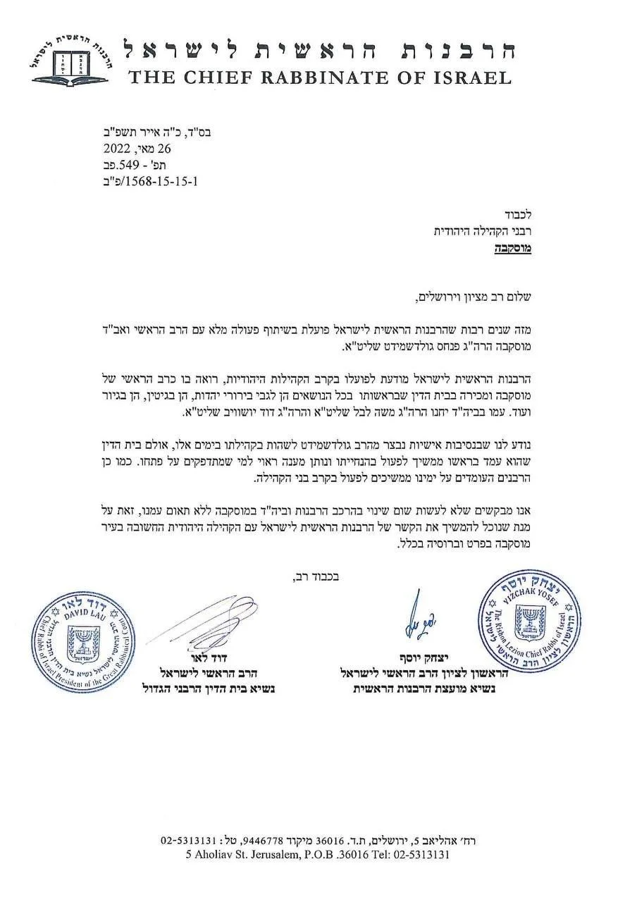 В своем решении о переизбрании Гольдшмидта МЕРО ориентировалась на авторитет главных раввинов Израиля — сефардского и ашкеназского — Ицхака Йосефа и Давида Лау. 26 мая они отправили МЕРО и другим традиционным еврейским общинам России специальное письмо с призывом поддержать главного раввина Москвы. Призыв звучал почти как ультиматум: «Не вносить никаких изменений в раввинат г. Москвы и в состав раввинского суда г. Москвы без согласования с нами, чтобы отношения главного раввината Израиля с еврейской общиной Москвы и России могли продолжаться».