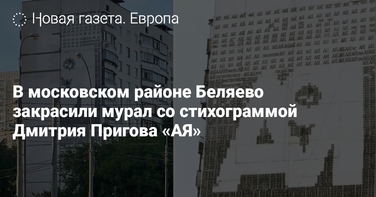 В московском районе Беляево коммунальщики во время капитального ремонта закрасили знаменитый мурал со стихограммой поэта Дмитрия Пригова «АЯ». Об этом изданию «Горький» сообщила участница инициативной группы по защите этого артефакта Анна Горская.