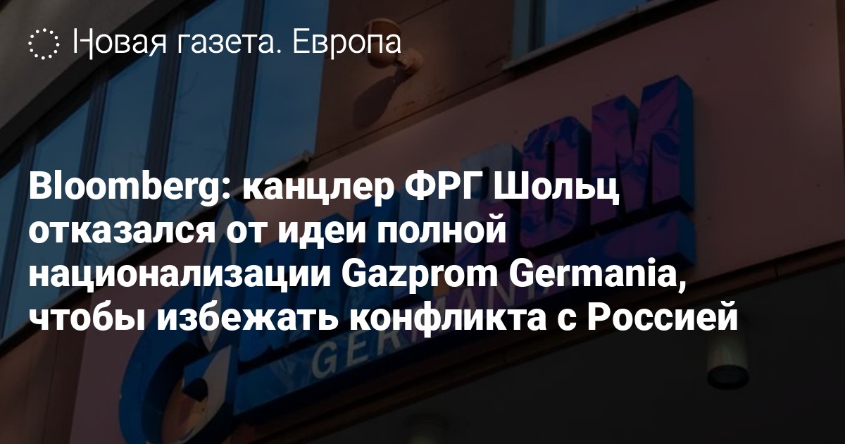 Канцлер ФРГ Олаф Шольц отказался от идеи полной национализации бывшего немецкого подразделения «Газпрома» Gazprom Germania, так как посчитал, что это «может разозлить президента России Владимира Путина» и привести к прекращению поставок российского газа, сообщает Bloomberg со ссылкой на источники.