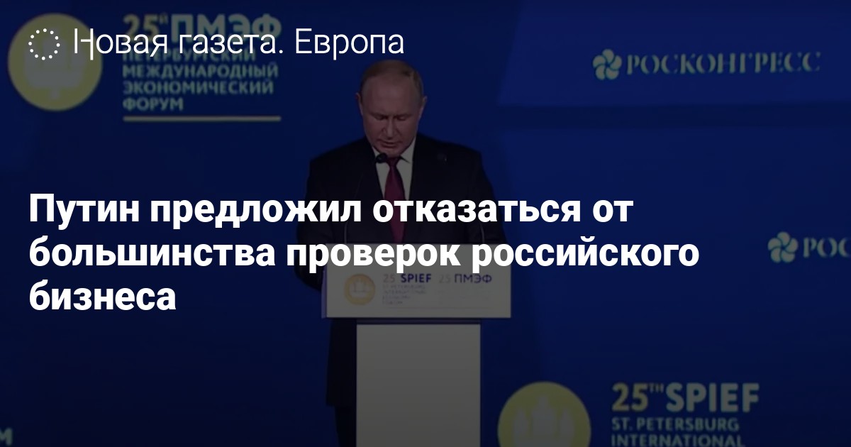 Президент России Владимир Путин во время выступления на Петербургском экономическом форуме предложил на постоянной основе отказаться от большинства проверок российского бизнеса, деятельность которого не связана с причинением вреда людям и окружающей среде. Трансляция идет на YouTube-канале «Комсомольской правды».