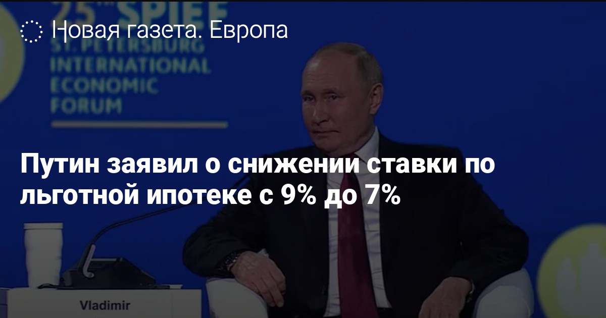 Президент России Владимир Путин во время выступления на Петербургском экономическом форуме заявил, что считает возможным снизить ставку по льготной ипотеке с 9% до 7%. Трансляция идет на YouTube-канале «Комсомольской правды».