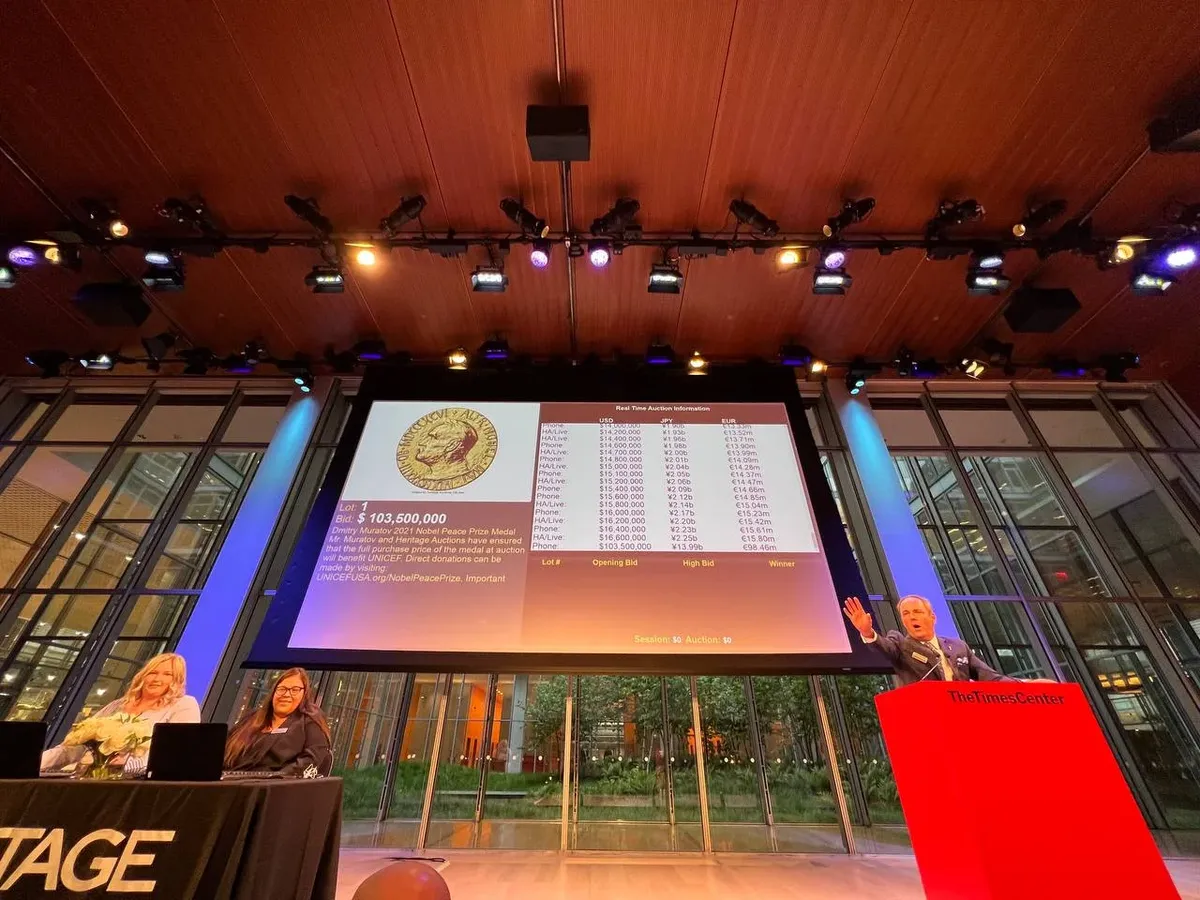 Американский аукционный дом Heritage Auctions продал на аукционе в Нью-Йорке Нобелевскую медаль премии мира 2021 года главного редактора «Новой газеты» Дмитрия Муратова за $103,5 млн.