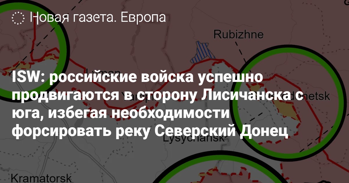Российские войска успешно продвигаются в сторону Лисичанска с юга, избегая прямого наступления со стороны Северодонецка, которое связано с необходимостью форсировать реку Северский Донец в Луганской области, заявили в американском Институте исследования войны (ISW).