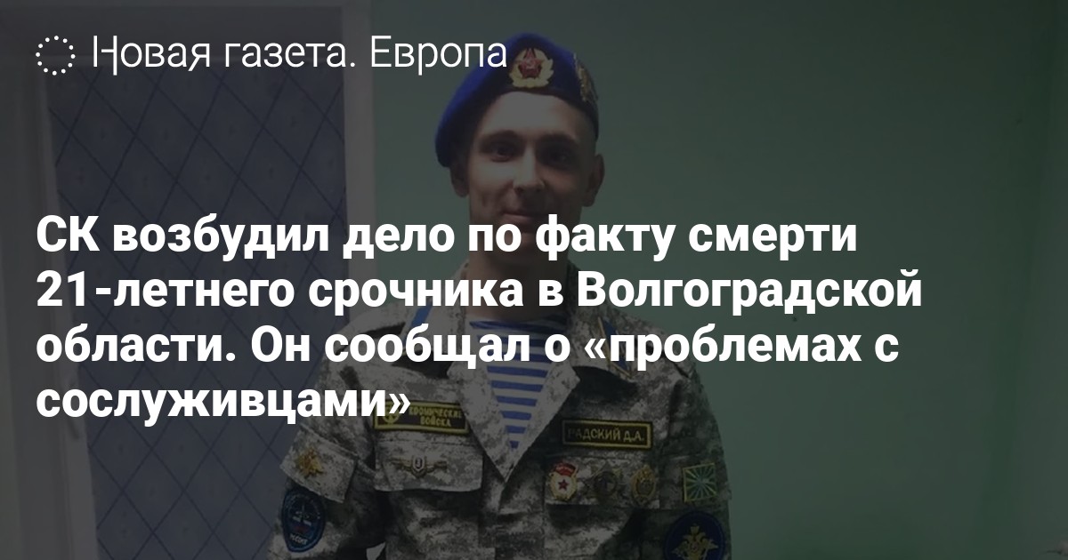 Следственный комитет (СК) по Волгоградскому гарнизону возбудил уголовное дело о доведении 21-летнего срочника Даниила Радского до самоубийства (ч. 1 ст. 110 УК). Об этом сообщает РБК со ссылкой на письмо управления ФСБ по объединениям дальней и военно-транспортной авиации.