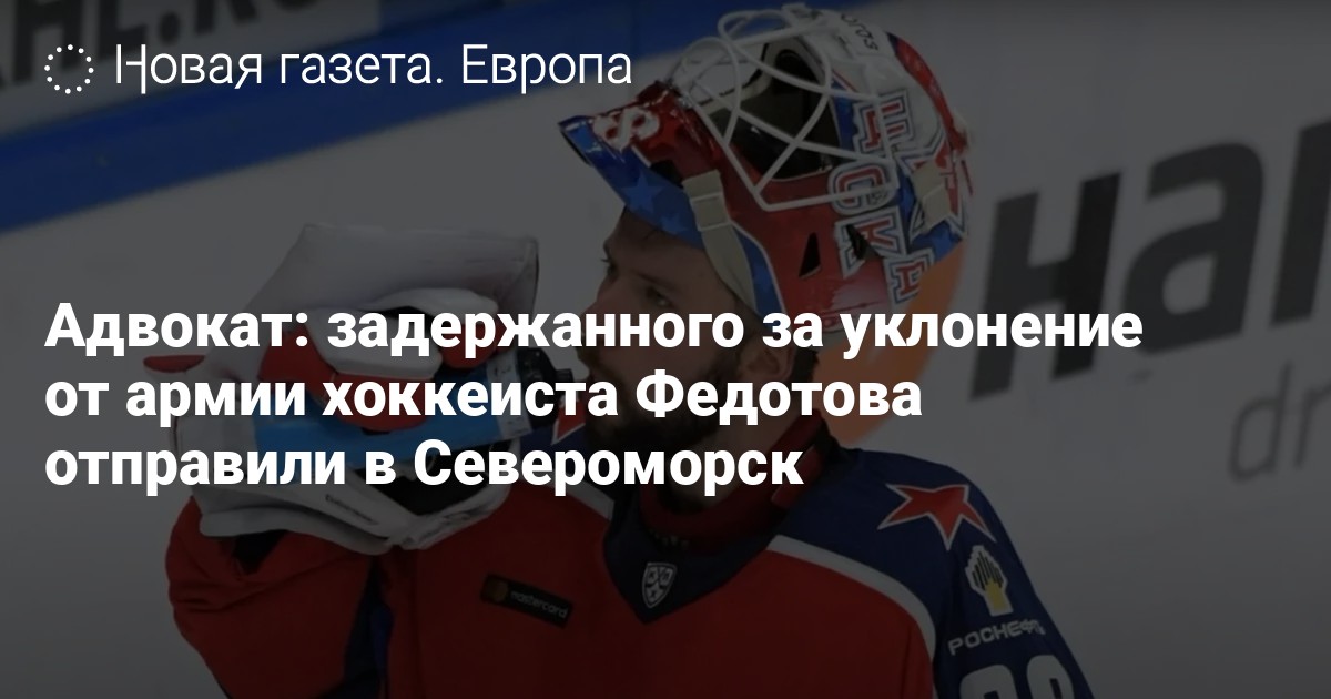 Вратаря хоккейного ЦСКА и сборной России Ивана Федотова, задержанного по делу об уклонении от армии (ст. 328 УК), отправили в Североморск. Об этом сообщает ТАСС со ссылкой на адвоката спортсмена Алексея Пономарева.