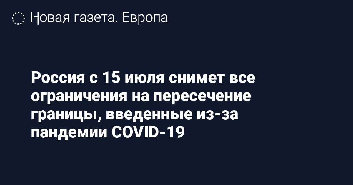 Россия с 15 июля отменяет ограничения на пересечение границы, введенные из-за распространения COVID-19. Об этом, как передает «Интерфакс», сообщили в оперштабе по борьбе с коронавирусной инфекцией.