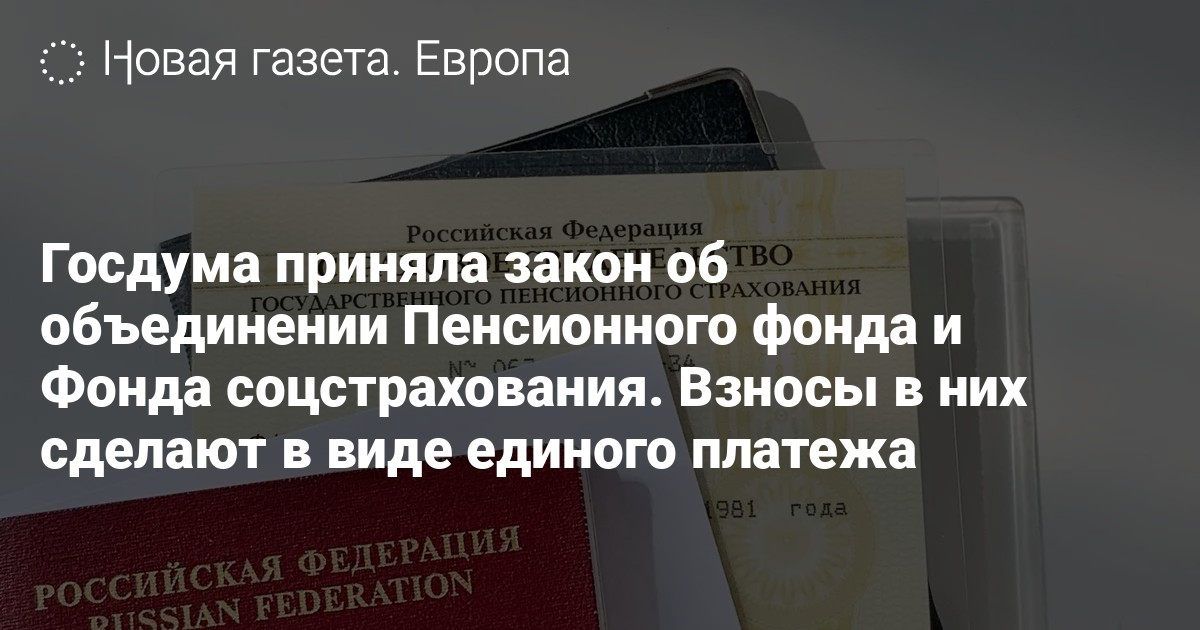 Госдума приняла закон об объединении Пенсионного фонда России (ПФР) и Фонда соцстрахования (ФСС) в единый Социальный фонд, сообщается на сайте нижней палаты парламента.