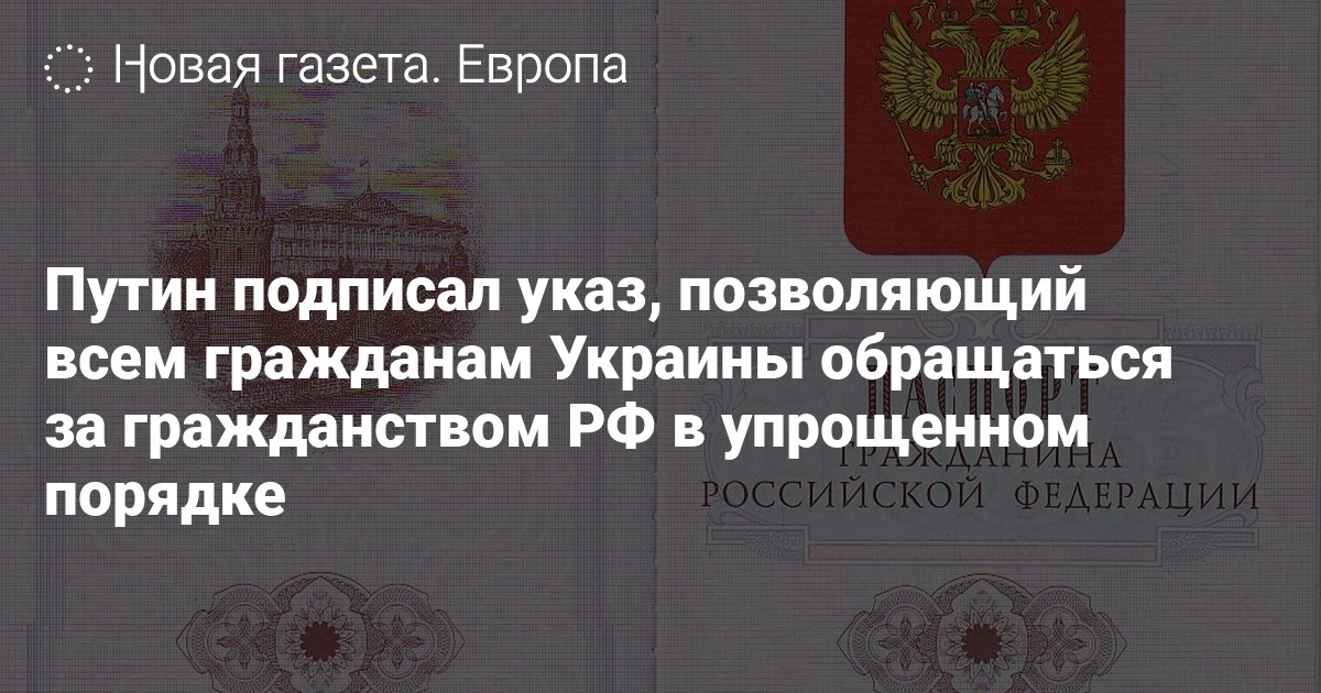 Президент России Владимир Путин подписал указ, позволяющий всем гражданам Украины обращаться за гражданством РФ по процедуре упрощенного порядка. Соответствующий документ опубликован на официальном интернет-портале правовой информации.