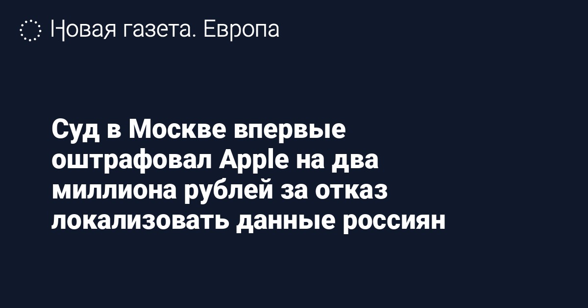 Мировой суд Москвы оштрафовал американскую корпорацию Apple на два миллиона рублей по ч. 8 ст. 13.11 КоАП РФ за отказ локализовать данные российских пользователей на территории России. Об этом сообщает ТАСС со ссылкой на корреспондента в зале суда.