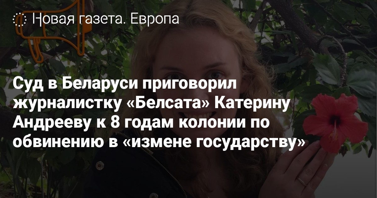 Гомельский областной суд приговорил журналистку телеканала «Белсат» Катерину Андрееву к 8 годам колонии по обвинению в «измене государству» (ч. 1 ст. 356 УК РБ), сообщает «Белсат». Суд проходил в закрытом режиме.