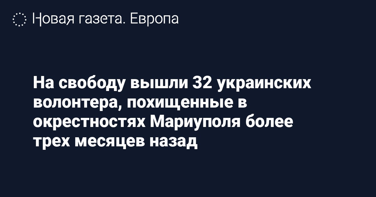 На свободу вышли 32 украинских волонтера, похищенные в окрестностях Мариуполя более трех месяцев назад. Об этом сообщает «Медиазона» со ссылкой на главу юридической службы проекта «Помогаем уехать» Полину Мурыгину, информацию также опубликовала украинская журналистка Альбина Львутина.