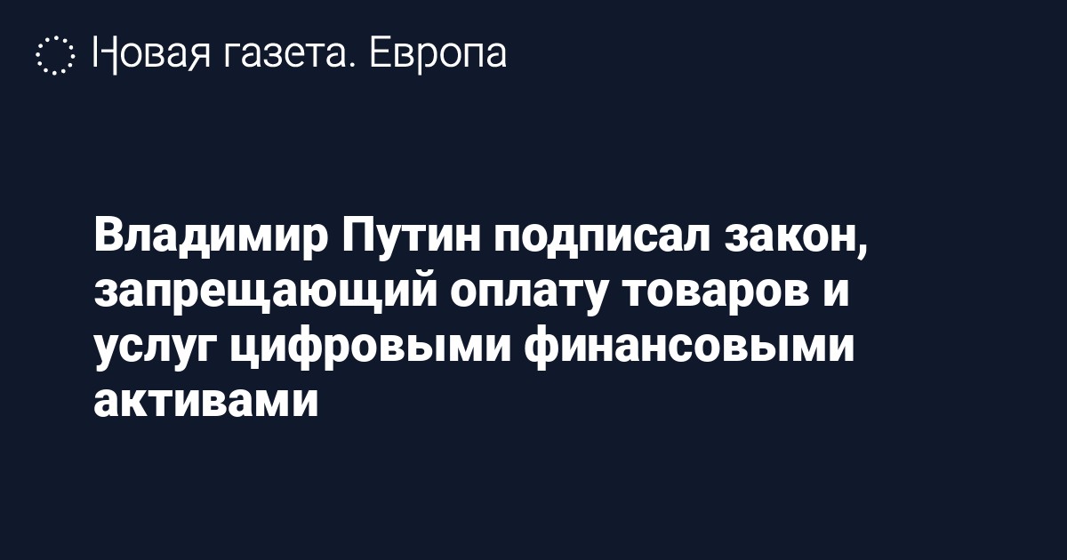 Президент России Владимир Путин подписал закон о регулировании оборота цифровых финансовых активов (ЦФА), который запрещает оплату ими товаров, работ и услуг в России. Документ опубликован на официальном интернет-портале правовых актов.
