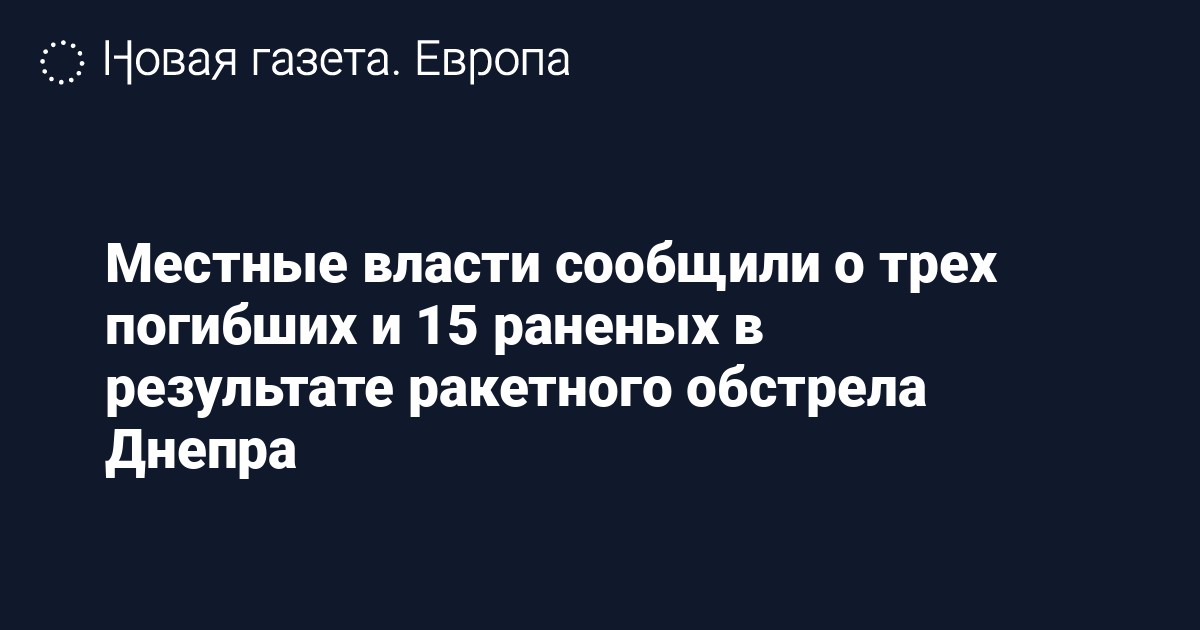 Глава Днепропетровской областной военной администрации Валентин Резниченко сообщил в своем телеграм-канале о трех погибших и 15 раненых в результате ракетного обстрела Днепра.