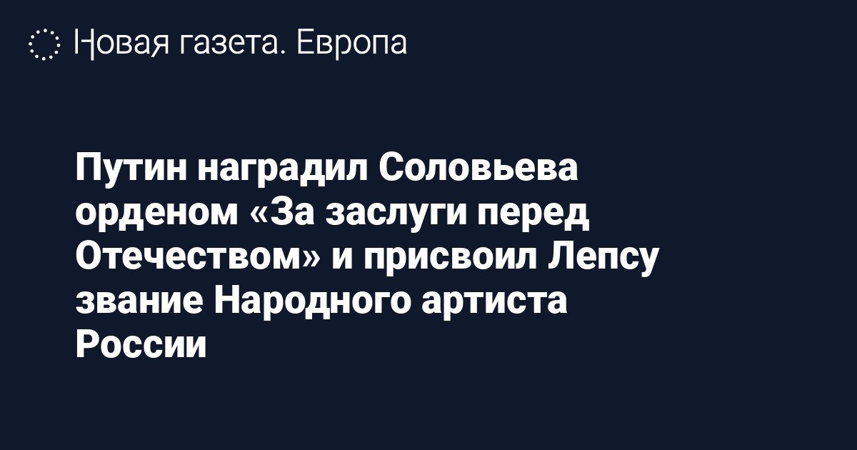 Согласно документу, Соловьева наградили орденом «за большие заслуги в формировании позитивного образа России и активное участие в общественно значимых мероприятиях». Лепсу присвоили звание народного артиста «за большие заслуги в развитии эстрадного искусства».