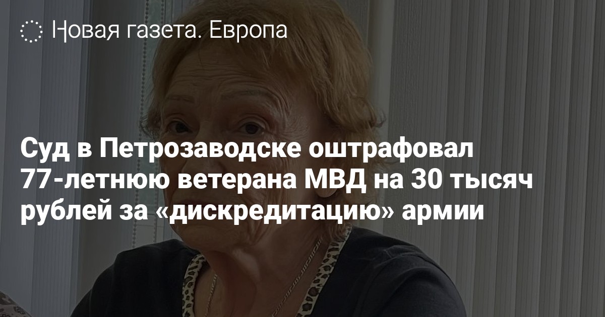 Суд в Петрозаводска дважды оштрафовал 77-летнюю инвалида второй группы и ветерана МВД Татьяну Савинкину за «дискредитацию» российской армии (ст. 20.3.3 КоАП). Об этом сообщила депутат Законодательного Собрания Карелии Эмилия Слабунова.