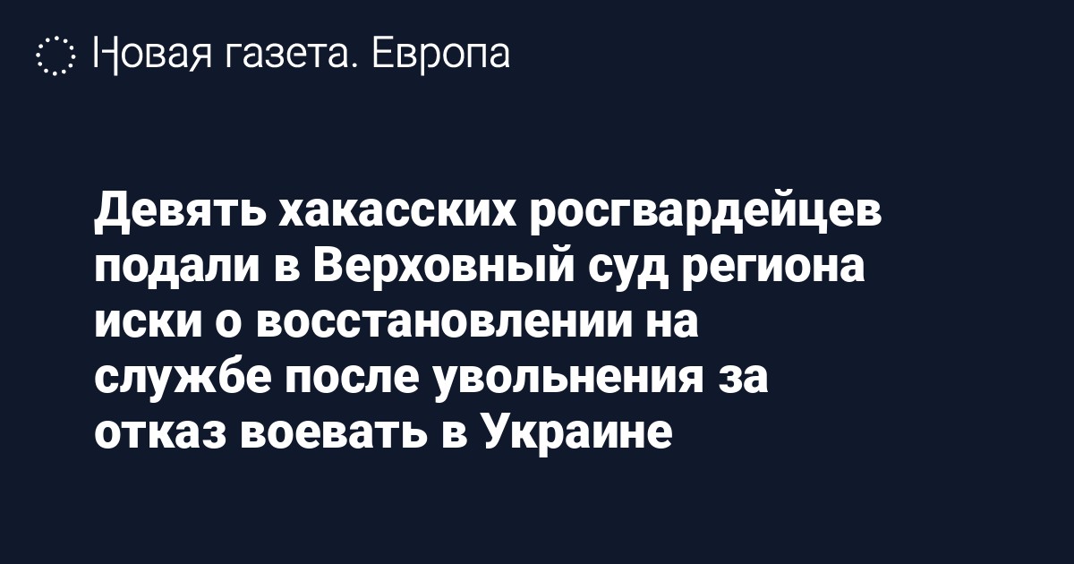 Минимум девять хакасских росгвардейцев подали иски о восстановлении на службе в Верховный суд региона после увольнения за отказ воевать в Украине. Об этом сообщает глава «Агоры» Павел Чиков со ссылкой на Владимира Васина, адвоката главреда «Нового Фокуса» Михаила Афанасьева.