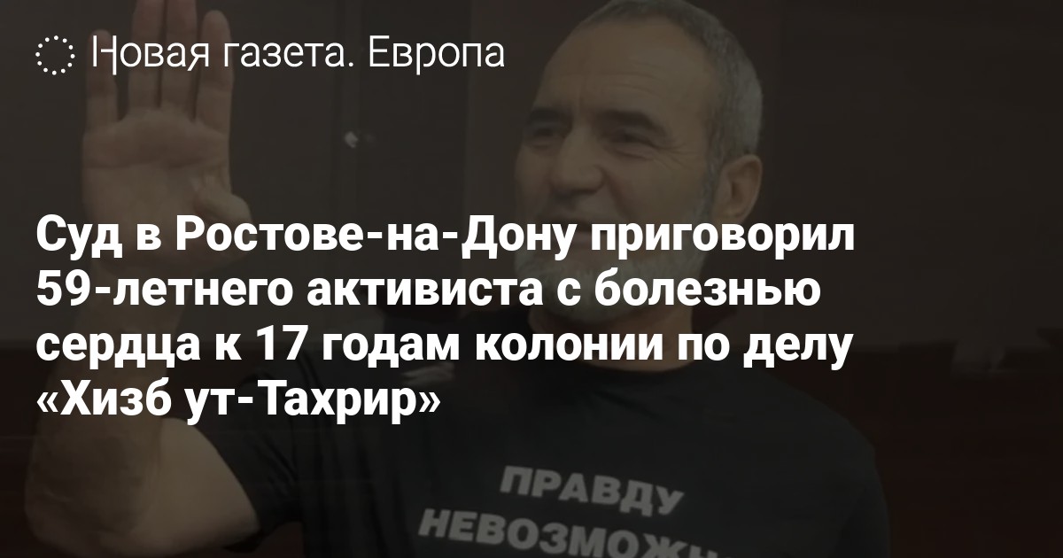 Южный военный окружной суд Ростова-на-Дону приговорил 59-летнего крымскотатарского активиста Азамата Эюпова к 17 годам колонии строгого режима по делу «Хизб ут-Тахрир». Об этом сообщает движение «Крымская солидарность».