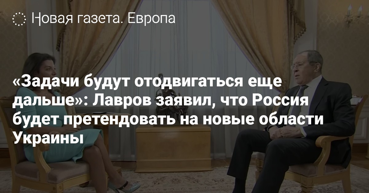 Министр иностранных дел России Сергей Лавров заявил, что географические задачи в войне России с Украиной расширились и вышли за пределы самопровозглашенных ДНР и ЛНР. Об этом он рассказал в интервью РИА Новости и RT.
