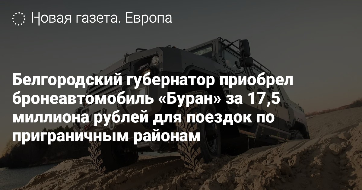 Администрация Белгородской области приобрела для главы региона Вячеслава Гладкова бронеавтомобиль «Буран» за 17,5 миллиона рублей. Карточка контракта опубликована на портале госзакупок.