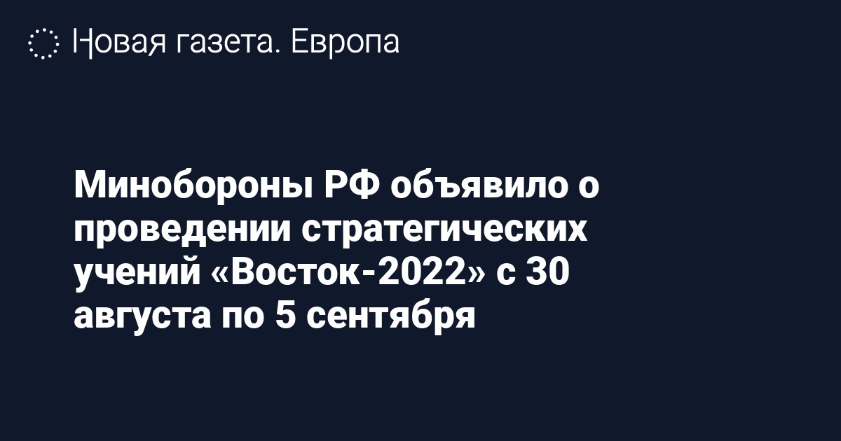 Минобороны РФ проведет 30 августа по 5 сентября 2022 года стратегические учения «Восток-2022» с войсками Восточного военного округа (ВВО). Об этом говорится в заявлении ведомства.