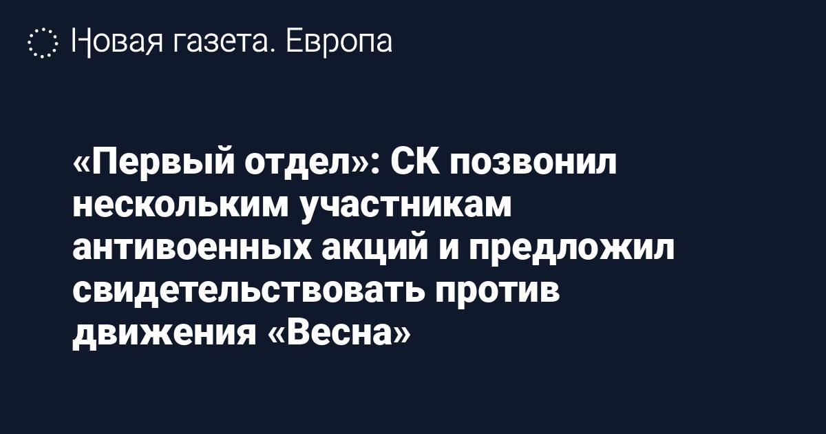 Несколько петербургских активистов, задержанных на антивоенных акциях в конце февраля, рассказали правозащитникам о том, что им позвонили из управления Следственного комитета по Северо-западному федеральному округу и предложили стать свидетелями обвинения по делу движения «Весна». Об этом пишет «Первый отдел».