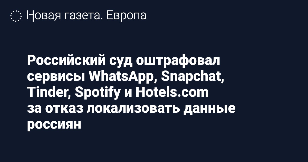 Мировой суд Таганского района Москвы оштрафовал мессенджер WhatsApp, социальную сеть для обмена фото и видео Snapchat, приложение для знакомств Tinder, стриминговый сервис Spotify и сайт для бронирования отелей Hotels.com за отказ локализовать данные российских пользователей (ч. 8, 9 ст. 13.11 КоАП РФ). Об этом сообщили «Интерфакс» и РИА Новости.
