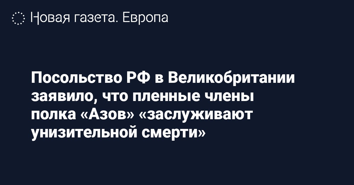 Российское посольство в Великобритании заявило, что пленные члены полка «Азов» заслуживают «смерти не через расстрел, а через повешение».