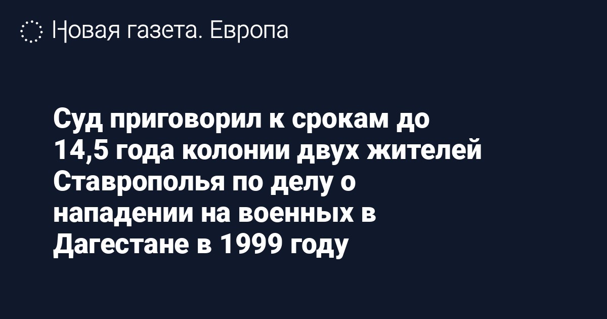 Южный окружной военный суд в Ростове-на-Дону приговорил к срокам до 14,5 года колонии жителей Ставрополья Суртланбека Аджиньязова и Русланбека Арсланова по делу о нападении на военнослужащих в Ботлихском районе Дагестана в 1999 году. Об этом сообщает «Интерфакс».
