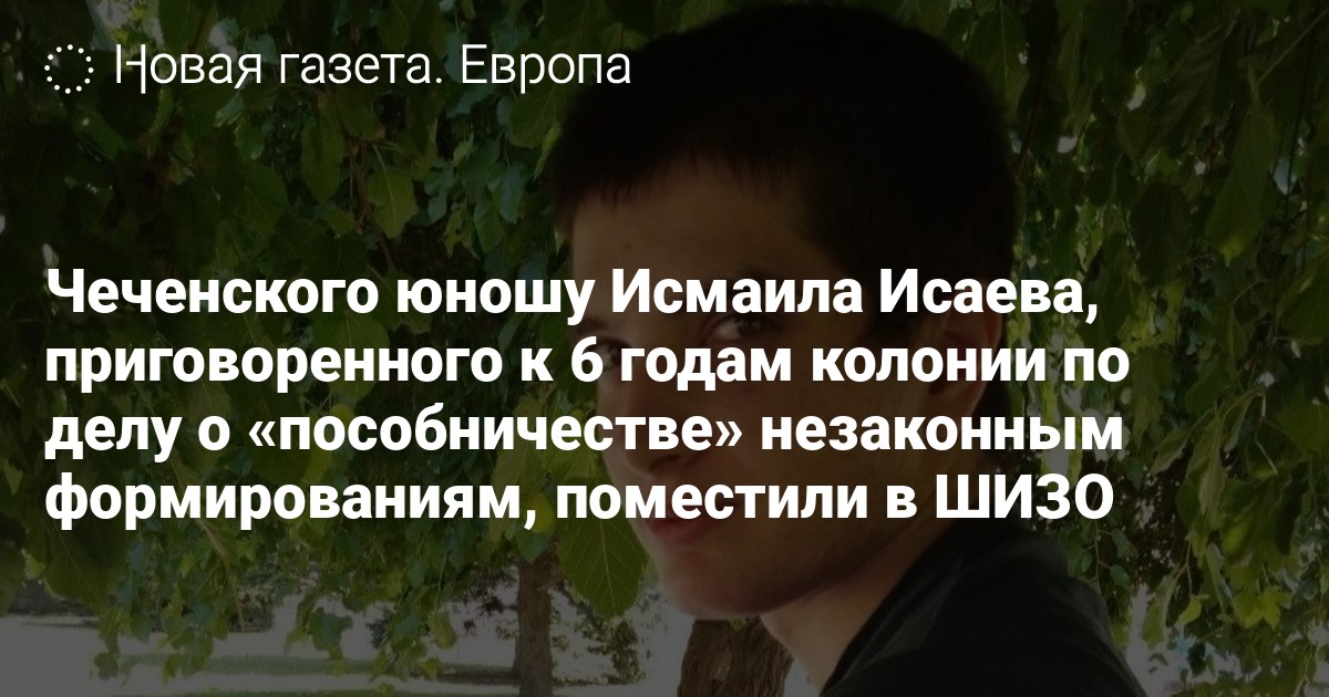 Чеченского юношу Исмаила Исаева, которого в феврале этого года приговорили к шести годам колонии по обвинению в пособничестве незаконным вооруженным формированиям (НВФ) (ч. 5 ст. 33 ч. 2 ст. 208 УК), удерживают в карцере ИК-11 в Краснодарском Крае. Его поместили в ШИЗО на неопределенный срок и без объяснения причин, рассказали «Новой газете. Европа» в «Кризисной группе СК SOS».