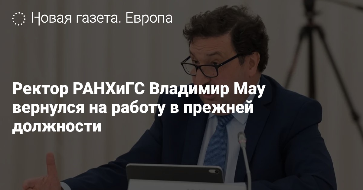 Ректор РАНХиГС Владимир Мау вернулся на работу в академию в прежней должности. Об этом сообщает РБК со ссылкой на представителя академии.