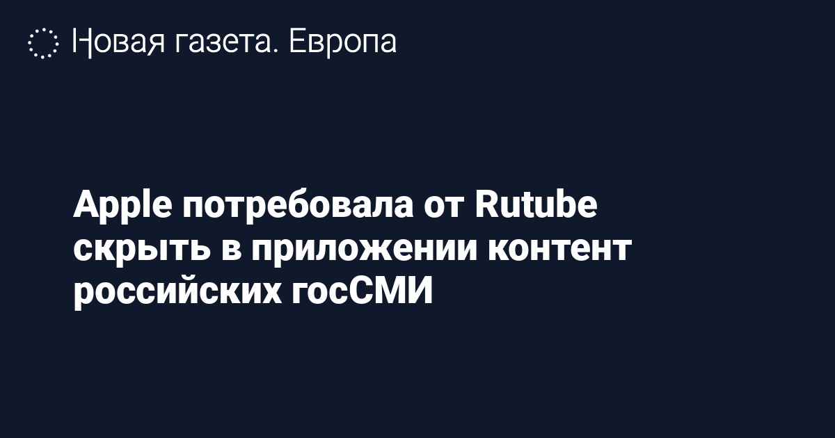 Компания Apple потребовала от видеохостинга Rutube в течение двух недель скрыть в приложении для iOS контент государственных СМИ России. Об этом сообщает «Интерфакс» со ссылкой на пресс-службу Rutube.