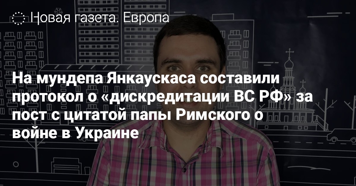 В Зюзинский районный суд Москвы поступил протокол на муниципального депутата по району Зюзино Константина Янкаускаса о «дискредитации вооруженных сил РФ» (ч. 1 ст. 20.3.3 КоАП РФ) за пост «Вконтакте», в котором он процитировал молитву папы Римского о прекращении войны в Украине. Об этом сам депутат написал в фейсбуке.