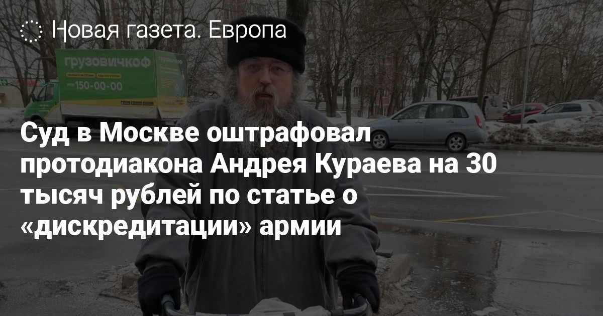 Никулинский районный суд Москвы оштрафовал протодиакона Андрея Кураева на 30 тысяч рублей по статье о «дискредитации» Вооруженных сил России (ч. 1 ст. 20.3.3 КоАП) за пост о войне в Украине в «Живом журнале». Об этом он сообщил в фейсбуке, соответствующая запись появилась в карточке дела на сайте суда.