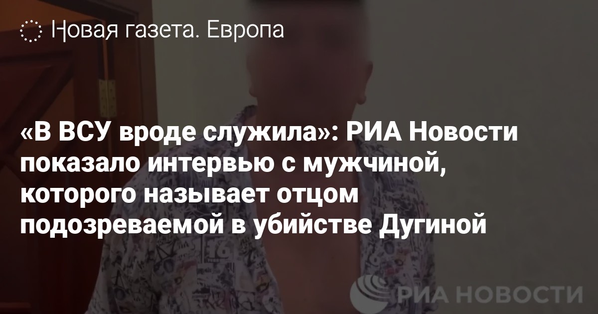 РИА Новости показало фрагменты интервью с мужчиной, которого называет отцом Натальи Вовк, подозреваемой в убийстве Дарьи Дугиной. У мужчины скрыто лицо, он не называет свое имя и не уточняет, как зовут его дочь.