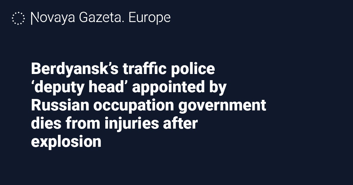 Oleksiy Kolesnyk, “deputy head” of the traffic police of Ukraine’s Berdyansk, Zaporizhzhia region, appointed by the Russian occupation government, has died from wounds following an explosion, report Russian news agencies Interfax and RIA Novosti, citing the occupation administration.