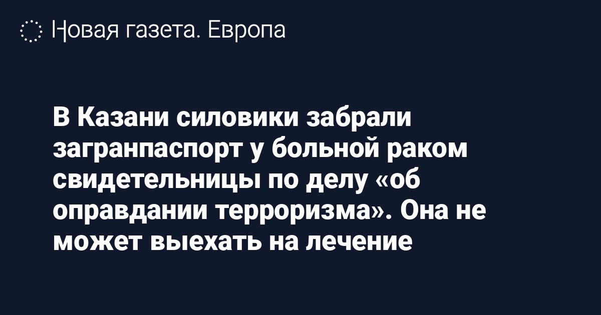 После прошедших в Казани обысков у журналистов, сотрудничающих с «Радио Свобода», у работающей на «Татполит» и «Азатлык Радиосы» Марины Юдкевич изъяли загранпаспорт. Теперь она не может поехать на лечение рака в Израиль, пишет проект «Сетевые Свободы».