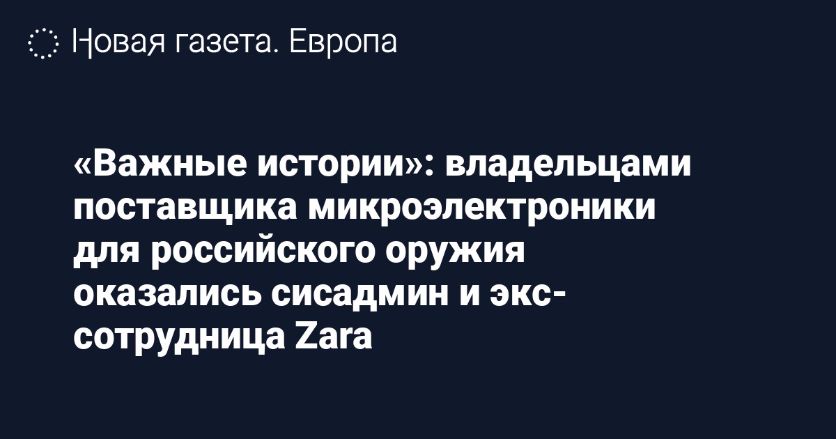Поставками микроэлектроники для российского оружия и боеприпасов занимается компания «Спец-ЭК», которой владеют сисадмин Леонид Непершин и Виктория Демьянова, до недавнего времени работавшая в магазинах Zara. Это выяснили «Важные истории»*.