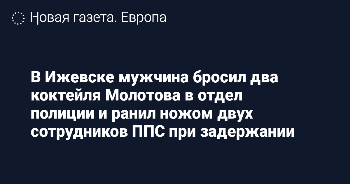 «Около 02:00 (01:00 мск) неизвестный мужчина бросил в здание отдела полиции №2 в Ижевске две бутылки с зажигательной смесью. На место прибыли сотрудники ППС, подозреваемый при задержании оказал активное сопротивление, ранив ножом двух полицейских. После предупредительных выстрелов полицейскими было применено табельное оружие. Нападавший был ранен, доставлен в медицинское учреждение. Двое полицейских, получивших ножевые ранения, также доставлены в больницу», — цитируют пресс-службу МВД в агентстве.