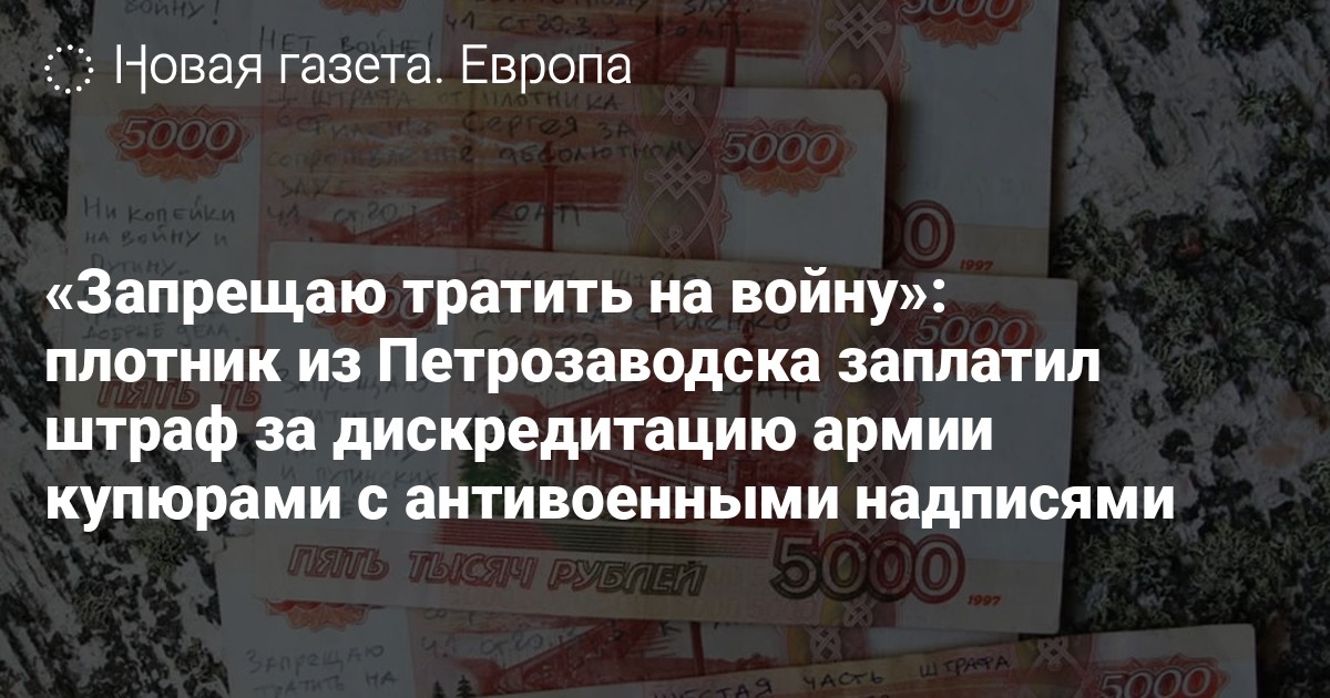 Плотник, писатель и блогер из Петрозаводска Сергей Филенко заплатил штраф за дискредитацию армии (ч.1 ст.20.3.3 КоАП) пятитысячными купюрами, которые он подписал антивоенными лозунгами. Об этом он рассказал в фейсбуке.