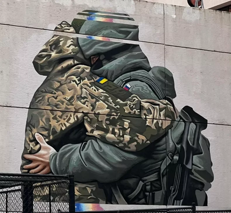 В Мельбурне после жалоб Австралийской федерации украинских организаций и посла Украины в Австралии Василия Мирошниченко закрасили рисунок с обнимающимися украинским и российским солдатами. Об этом сообщил Мирошниченко в твиттере.