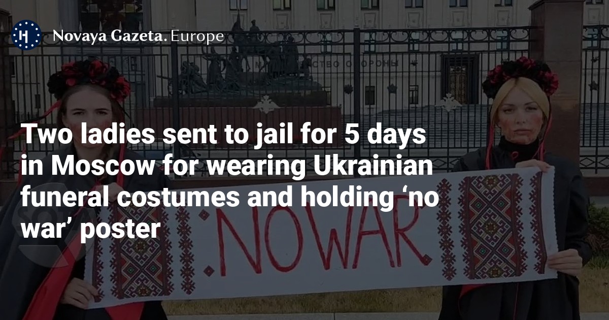 They were wearing Ukrainian funeral costumes and holding a poster reading “no war”. The two have been charged with “organising an unapproved event” and “discrediting the Russian army.”