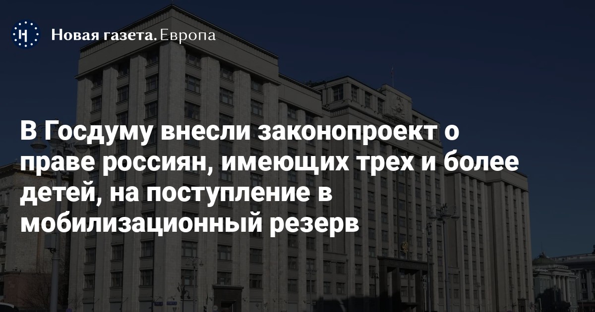В Государственную думу внесли законопроект о праве граждан, имеющих трех и более детей, на поступление в мобилизационный резерв. Документы опубликованы в системе обеспечения законодательной деятельности.
