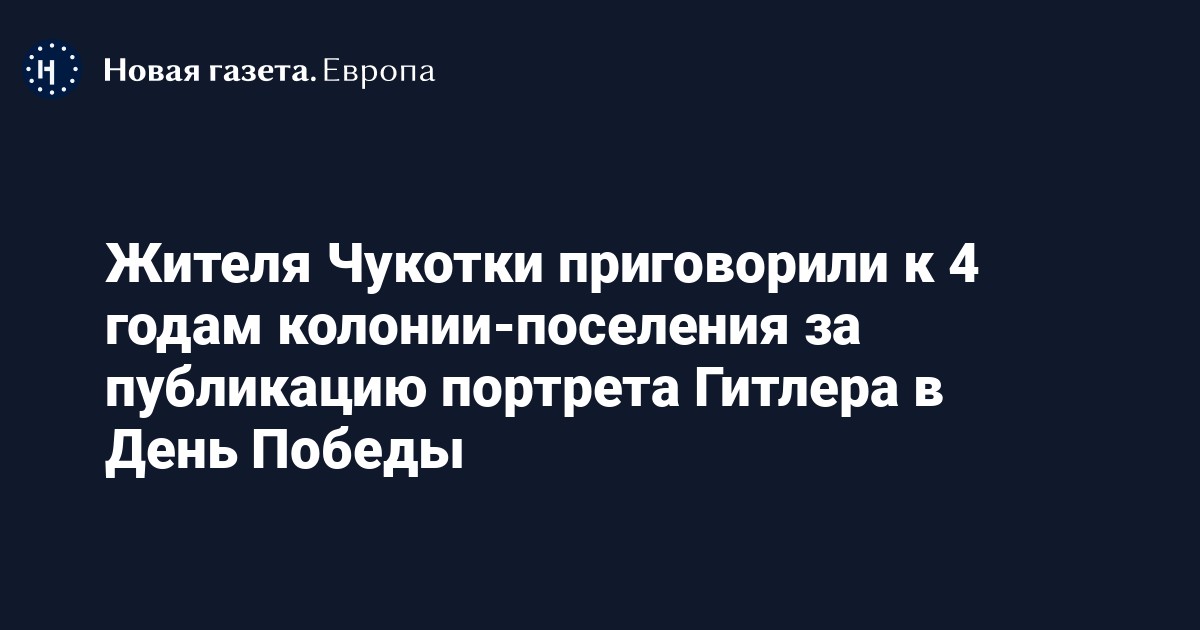 Чукотский окружной суд приговорил 31-летнего жителя города Певек к четырем годам лишения свободы в колонии-поселении за публикацию фотографии Адольфа Гитлера в чатах «популярного мессенджера», участники которых обменивались поздравлениями с Днем Победы. Об этом сообщает пресс-служба региональной прокуратуры.
