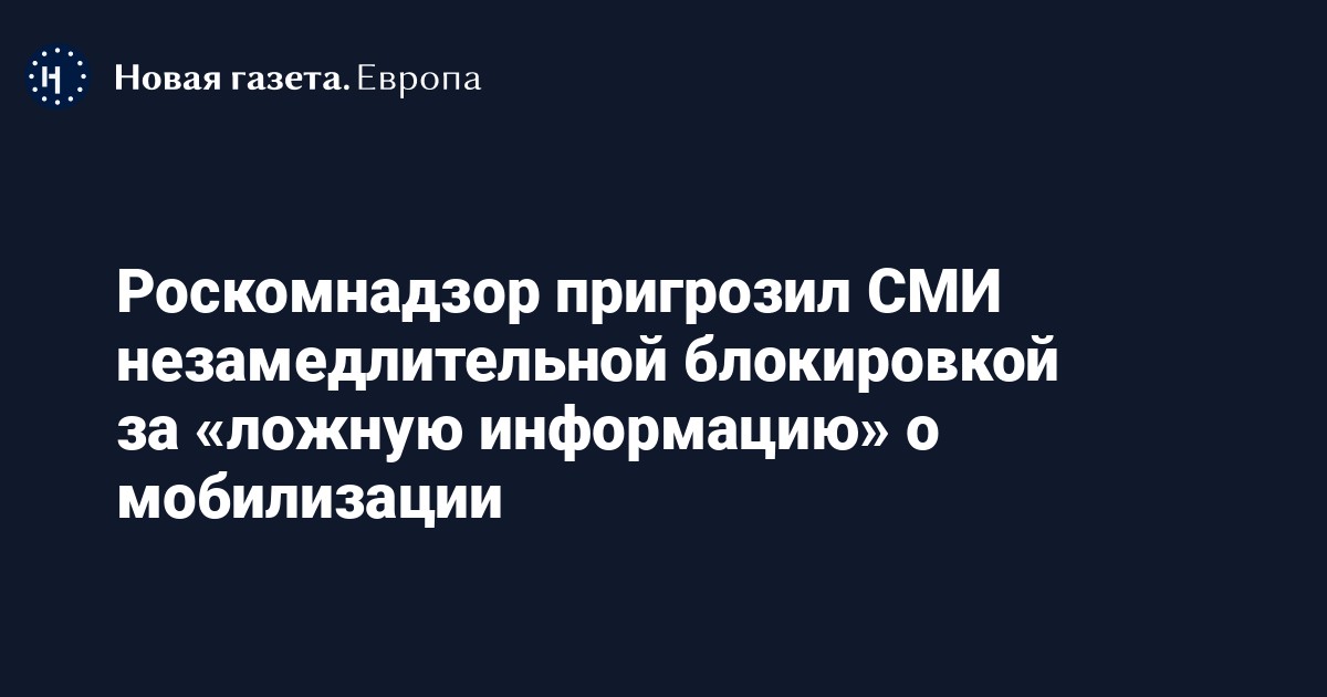«Роскомнадзор информирует средства массовой информации и информационные ресурсы о необходимости при подготовке и публикации материалов, касающихся проведения мобилизационных мероприятий на территории Российской Федерации, использовать информацию и данные, полученные исключительно от федеральных и региональных органов исполнительной власти», — говорится в сообщении.