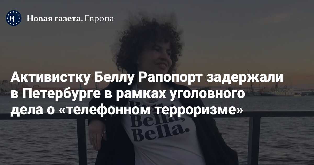 В Санкт-Петербурге фем-активистку Беллу Рапопорт задержали на 48 часов после обыска. Об этом сообщил в телеграме журналист Борис Конаков.